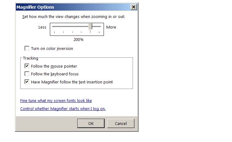 When relying on a screen magnification program, tracking various elements of the screen can be very important, especially at higher levels of magnification. Magnifier provides three options for tracking elements on the screen: text insertion point, mouse pointer, and keyboard focus. Zoom also provides tracking of the text insertion point and the mouse, but does not provide tracking of the keyboard focus. This is a significant disadvantage with Zoom, since keyboard focus can be very helpful when accessing pull-down menus and other controls via the keyboard.
