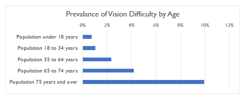 According to 2015 estimates from the American Community Survey [2], about 1 in 15 seniors aged 65 and up has "serious difficulty seeing, even when wearing glasses or contacts." For seniors aged 75 and up, the prevalence is almost 1 in 10. Age-related vision loss occurs more often among people who are already disproportionality under-represented in the labor market, including women, minorities, and people of lower socio-economic status. Thus, it is imperative that any conversation about improving supports for seniors and the labor market be inclusive of considerations for seniors with vision loss.